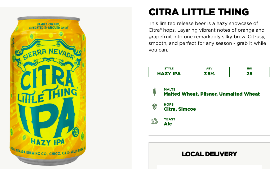 I wrote the core product messaging for Sierra Nevada’s limited run hazy IPA, Citra Little Thing, which was used as a template for packaging, digital marketing materials, restaurant tasting notes, and more.